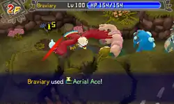 Braviary flies at the opponent and strikes it with one of his wings, or Braviary flies up into the sky and flies down into the opponent. | ||