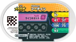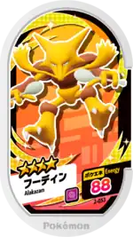 Alakazam (Japanese: フーディン Foodin) is a Grade 4 Pokémon Mezastar tag. It is part of the second set.