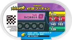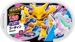 Alakazam (Japanese: フーディン Foodin) is a Grade 5 Pokémon Mezastar tag. It is part of the second Super Tag set.