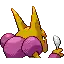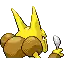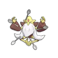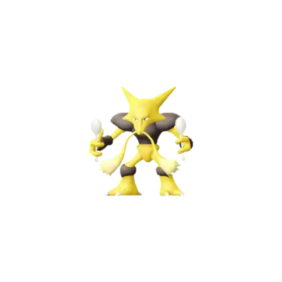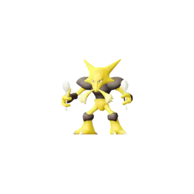 Alakazam is a slightly humanoidPokémon with a large mustache. A female Alakazam has a significantly shorter mustache than a male. It has a long, thin snout, narrow eyes, ear-like spikes extending from the top of its head, and an additional spike protruding from each cheek. Covering its yellow, skeletal body are brown armor-like sections over its chest, shoulders, forearms, and knees. There are three toes on each foot, each of which has a white claw. Two of the toes face forward, while one faces backward. It wields a silver spoon in each hand, which act as amplifiers for its psychic abilities. The spoons are created using its psychic powers, and it may give one to someone it trusts. According to its Pokémon Ultra Moon Pokédex entry, anything eaten with the spoon becomes delicious.