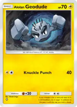 Alolan Geodude (Japanese: アローライシツブテ Alolan Isitsubute) is a Lightning-type Basic Pokémon card in Pokémon Trading Card Game Pocket. It is part of the Celestial Guardians expansion.
