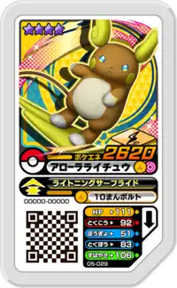 Alolan Raichu (Japanese: アローラライチュウ Alolan Raichu) is a Grade 4 Pokémon Ga-Olé disk. It is part of the fifth set.