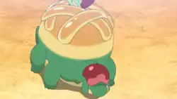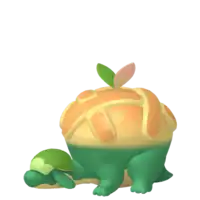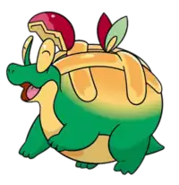 Appletun is a dragon-like Pokémon whose body is reminiscent of apple pie. It is mostly green with a yellow underside and lower jaw, and it has an orange spot on its chest that resembles an apple core.[1] It has a piece of an apple on its head worn as a helmet. Its leaf-like eyestalks usually droop down from under the apple helmet as though they were ears, but may be lifted up to reveal small beady eyes. It has black slits for nostrils on the tip of its muzzle. It has a large hump on its back with several overlapping stripes that resemble an apple pie's crust on top, along with a pair of red and green leaves. It has four short, bulky legs with paws, and a stout tail.