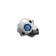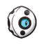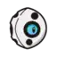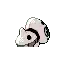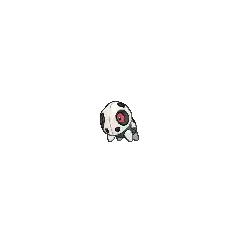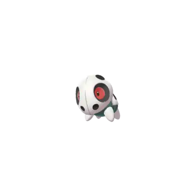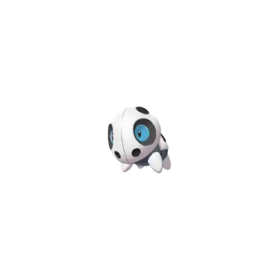 Aron is a quadrupedal Pokémon with four stubby legs and a large round head. Its body is black with plates of gray steel armor covering its head, back, and legs. Throughout its body are small openings in the armor. There are six openings on its head, with the largest two being openings for its pale blue eyes and one opening on either side of the spike on its back. A single, blunt spike protrudes from its back.
