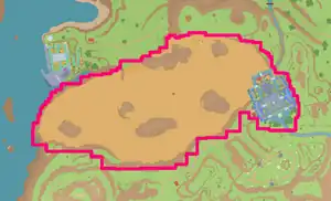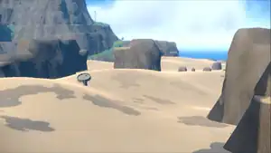 The Asado Desert connects to West Province (Area Two) on the west and Cascarrafa on the east. The desert is very large and there will often be a sandstorm occuring. Like many other locations in Paldea, Asado Desert has a watchtower that serves as a fly point, however unlike other watchtowers, this one is mostly buried underneath the sand. There are several large rock formations throughout the desert that can be climbed once the player has unlocked the ability to climb walls on their Koraidon or Miraidon.