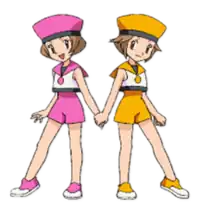 Audrey and Kathryn are a bubbly duo of girls who are often seen giggling to each other. They work perfectly together as a team, and on occasion, they speak in unison. The twins have a close bond with their Pokémon and speak highly of their older brother Rafe's skills as a Trainer, as well as his Blaziken's battling skills.