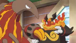 After theiradventures in Twist Mountain, Ash and his friends decide to stay at Don George's Battle Club in Astilbe Town for the night. Before reaching their room, the group comes across a Double Battle being held in one of the Club's rooms between a Trainer's Watchog and Mienshao and another Trainer's Heatmor and Emboar. Ash finds out more about Heatmor on his Pokédex. Mienshao uses Drain Punch on Heatmor and Watchog lifts and Slams Emboar onto the ground. The other Trainer declares that he will show everyone the true power of the "Fire Warriors" and orders Emboar to use Hammer Arm on both opponents and for Heatmor to do the same with Flame Burst. Flame Burst creates a fiery explosion and knocks out both of the opponent's Pokémon, winning the battle for the Fire Trainer, whose name is Shamus.