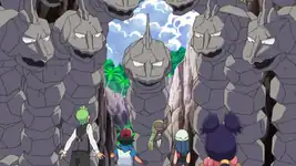 Ash and his friends enter a cave, searching for some sign of an Onix. Iris and Cilan both show apprehension when Ash and Dawn explain how large they are, and one suddenly begins barreling through the cave. Sprinting away from it, they all encounter a few more Onix before escaping the cave - but unfortunately, they become separated in the process. Iris, Dawn, and Axew are together, but they realize that Piplup must be with Ash, Cilan, and the other Pokémon. After trying and failing to reenter the cave, Dawn and Iris decide to head for the beach in the hopes that Ash and Cilan will do the same. Meanwhile, Ash, Cilan, Meloetta, Piplup, and the other Pokémon begin trekking to the beach as well. Soon, however, they are accosted by three Onix. Although Piplup and Oshawott try to drive them away, they are unsuccessful, but Meloetta intervenes just in time. It uses Relic Song to change to its Pirouette Forme and defeat the Onix with Close Combat.