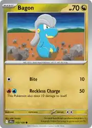 Bite is a move in the Pokémon games that Bagon can learn. Reckless Charge is an attack that first appeared on Carvanha from EX Holon Phantoms. This card's Pokédex entry comes from Pokémon Scarlet.