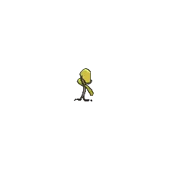 Bellsprout is a plant-based Pokémon with a stem-like brown body. There is a single green leaf on each side of its body. It has a yellow bell-shaped head with what appear to be pink lips at the end and beady black eyes. It is capable of spitting corrosive acid from its mouth. Its stem is long, thin and very flexible, making it capable of swerving rapidly to avoid many attacks or moving with blinding speed to capture prey. Its roots resemble feet, and it uses them as such.