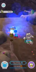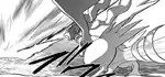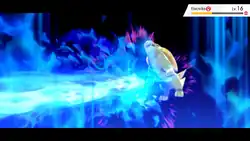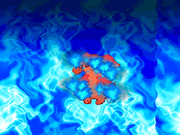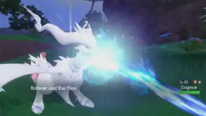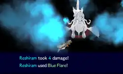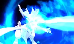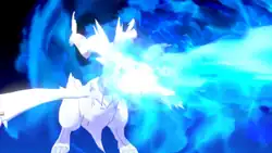 Reshiram fires a powerful stream of light blue flames from its mouth at the opponent. | ||