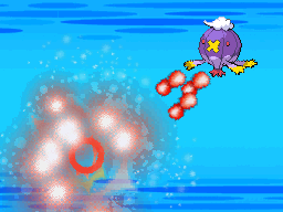 Swanna flies into the air and flies down at the opponent like a missile, its body bursting into flames. Then, its body becomes surrounded by a blue aura, and it slams into the opponent. When the glow fades, light blue sparks run up Swanna's body as it takes recoil damage. | ||
