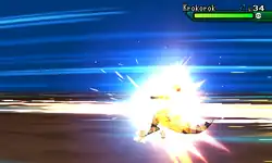 Staravia pulls in its wings and dives down at the opponent like a missile, its body bursting into flames. Then, it pulls out its wings, and its body becomes surrounded by a blue aura, and it slams into the opponent. When the glow fades, light blue sparks run along Staravia's body as it takes recoil damage. | ||