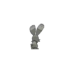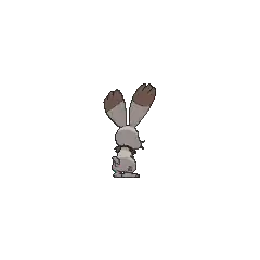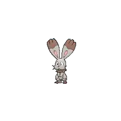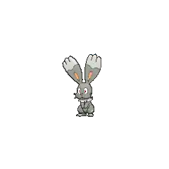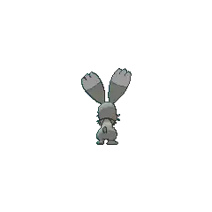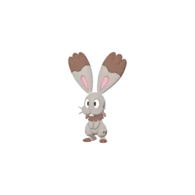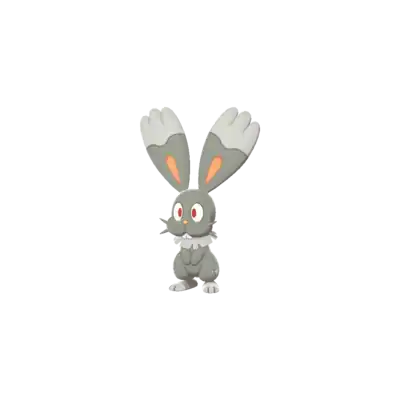 Bunnelby is a small, gray, rabbit-like Pokémon . The tips of its large ears are dark brown and have three finger-like sections each. It has black eyes, a small pink nose, prominent round cheeks, two tiny whiskers on each cheek, and large upper incisors. Its neck is surrounded by a ruff of stiff, brown fur. There are small brown spots on its hind legs and it has brown toes. It also has a fluffy gray tail.