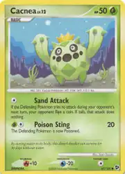 Poison Sting and Sand-Attack are both moves in the Pokémon games that Cacnea can learn. This card's Pokédex entry comes from Pokémon Diamond and Pearl.