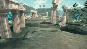 The ruins stretch across a long expanse of flat land atop the highlands. On the western side, a portion of the ruins sits on an elevated cliff which is directly connected to the Sacred Plaza. Two sets of ruined stone columns run parallel with the cliff. At the center of the columns, a dilapidated statue of Giratina remains standing on a pedestal; a large crack in the pedestal runs between the legs of Giratina, which are the only discernable remnants of the statue.