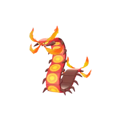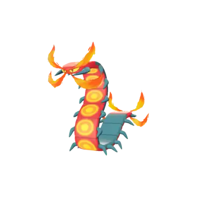 Centiskorch is a flat, centipede-like Pokémon. It is red, with circular orange-yellow heat-generating organs on the underside of each section, while its dorsal side, along with its legs and mandible, are a darker shade of red. The head has an orange mark in the shape of an exclamation point ("!") on the top, and two bright yellow eyes with triangular red pupils. It has orange-yellow flames coming out of its head and rear, simulating antennae and telson. Centiskorch creates flammable gases by fermenting the food in its body, and then burns these gases through the heat-generating organs along its underside. This results in the overflowing flames on either end of its body, which can reach temperatures of almost 1,500 °F (800 °C).[1] As shown in the manga, the flames on its head can turn off.