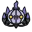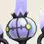 Chandelure is a Pokémon that resembles a sentient chandelier. It has a striped, round head, and round, pupil-less yellow eyes. There is a ring of small, black spikes on top of its head with a tall, purple flame in the middle. From a black spike below its head, black arms curl upward. These arms are tipped with purple fire.
