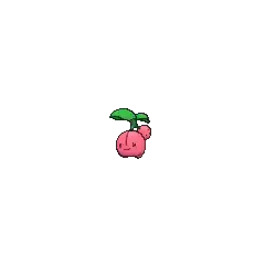 Cherubi is a small, cherry-like Pokémon with a round, deep-pink body with two stubby feet. The body becomes redder when bathed in sunlight, which signals that it has stockpiled a lot of nutrients. It has beady eyes and a purple-red stripe running down part of its face. Cherubi has a short stem with two big, green leaves and a second, much smaller head growing out of it. This second head is vestigial in terms of function, but it contains nutrients that contribute to Cherubi's growth as its initial source of food. The second head is apparently edible and has a sweet taste, and several Pokémon such as Starly have been seen trying to pluck it off. When the second head begins to bloom and wilt, it means Cherubi is close to evolving. The second head detaches after Cherubi evolves, which become food for other creatures. Cherubi is attracted to honey .