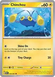 Chinchou (Japanese: チョンチー Chonchie) is a Lightning-type Basic Pokémon card. It is part of the Paldean Fates expansion.
