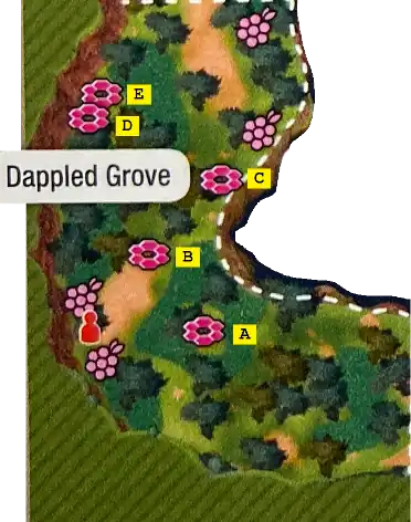 This den is near the middle of Dappled Grove, northeast of a pair of Berry trees on the western cliff wall.
