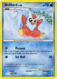 Present and Ice Ball are both moves in the Pokémon games that Delibird can learn. This card's Pokédex entry comes from Pokémon Diamond and Pearl.