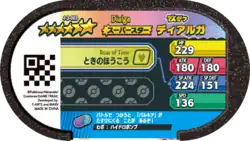 Dialga (Japanese: ディアルガ Dialga) is a Grade 6 Pokémon Mezastar tag. It is part of the third Gorgeous Star set.