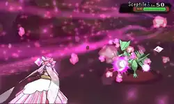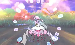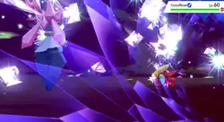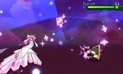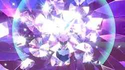 Mega Diancie compresses the carbon in the air by bringing its hands closer to its head and a pink energy is formed between its hands. The energy gets converted into diamonds as Mega Diancie takes its hands away. | ||