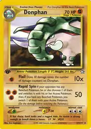 Donphan (Japanese: ドンファン Donfan) is a Fighting-type Stage 1 Pokémon card. It is part of the Neo Genesis expansion.