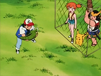 As the group continue their way through Viridian Forest, Misty lets out a shrill scream. Ash turns to find her in a tree because she saw a Bug-type Pokémon, though he makes light of her fear. He soon spots the Pokémon in question, a Weedle, and decides to catch it. He is forced to send out his Pidgeotto because Pikachu is asleep. Misty walks off, only to encounter a stranger named Samurai and his sharp sword. When he asks if she is from Pallet Town, she states that she's not, causing him to leave to continue his search. Misty is baffled as to what kind of grudge the stranger could have against Pallet Town inhabitants, but then she realizes the stranger is after Ash.
