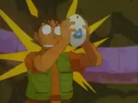 Ash and his friends follow a trail of broken red blue and green eggshells until they reach the shack. They decide to burst in, even though it may be dangerous to do so, and get the Egg back. Ash sends out Pidgeotto, Misty calls on Staryu, and Brock's Geodude lends a hand. They all quickly break through one of shack's windows, surprising Team Rocket. Pidgeotto retrieves the Egg, placing it in Ash's hands. Ash dives to the floor to avoid Arbok. James sends out Weezing, who uses a Poison Gasattack, making Ash and the others cough and gasp for air. Amongst the haze, Meowth Scratches Ash's face, causing him to let go of the Egg in pain and Meowth retrieves it. However, the Egg is tossed around frantically in a series of tackles and catches. Pidgeotto's Gust clears the air, and Meowth suddenly slips, sending the Egg into the air. Ash lunges for the Egg, though he fails to catch it. Fortunately, Pikachu ends up with the Egg and gives it back to Ash. At that moment, the Egg begins to glow and hatch.