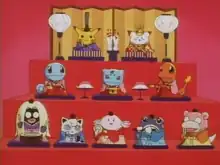 The Pokémon Princess Doll Set was specified in the Japanese version to be a three-tiered Hina doll set. In addition, the "Batteries sold separately" quip was dub-added.