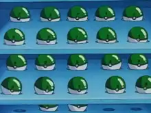 The group enters a section of the lab where Oak keeps the Pokémon caught by the Pallet Town Trainers in their Poké Balls. Ash has his own shelf, though almost all of the many Poké Balls on it are his Tauros's thirty Safari Balls. Gary is later mentioned to have caught over 200 Pokémon, meaning he has multiples of some Pokémon. Gary says that the more Pokémon a Trainer has, the better chance of winning. Ash retaliates, saying that Gary's Pokémon are not his friends, and that being friends with Pokémon is more important. Oak goes on to explain that people have different personalities, thus also having different ways of caring for Pokémon. He also says that Pokémon need to be respected and cared for like people.