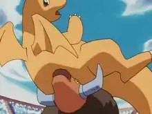 With Team Rocket out of the way, the battle continues. Ash sends out the worn-out Tauros against Dragonite. Drake commands Dragonite to fly up with Agility, followed by a Body Slam. Ash suddenly gets an idea and tells Tauros to take the hit, surprising Drake. The Body Slam hits, but doesn't have the intended effect. Using the sand on the battlefield to absorb the impact, Tauros has caught Dragonite in his horns. Tauros throws Dragonite into the air and it lands hard on the ground. Dragonite gets up and hits Tauros with Thunder, knocking the exhausted Pokémon out.