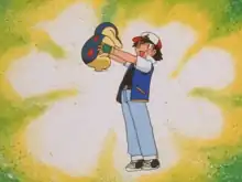 The dust settles, and Ash soon spots the Poké Ball lying nearby. He picks it up and throws it out, and much to his relief he has caught the Cyndaquil. Ash then commends Cyndaquil on its friendly nature and powerful Flamethrower attack. Misty and Brock arrive on the scene, and Ash explains that he went on to catch Cyndaquil. Koji emerges from the cave system and readies his Sandslash to attack. Ash holds him arms out and explains that he has already caught Cyndaquil. Koji challenges Ash to a battle over Cyndaquil. Ash accepts despite Brock's insistence that he doesn't have to, and even uses Cyndaquil in the battle, confident that it will use its powerful Flamethrower again. Koji declares that the match will be a one-on-one single Pokémon battle before the challenge ensues.