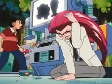 James walks around, with some money in hand from the snacks the trio sold earlier, and comes across a Magikarp salesman. Just as James agrees to buy the bargain Magikarp, he remembers the salesman, but the salesman manages to run off with his money. The man with the Stantler abandons the trade with Benny at the last minute after spotting a Hoothoot. Meanwhile, James chases after the salesman, Jessie gets in the way and is sent flying towards the real trade machine. Jessie falls and hits her head on the machine as the Poké Ball containing Lickitung flies out of her pocket and lands on the machine. The Poké Ball exchanges with Benny's while Jessie isn't looking. Unaware of the trade, she grabs the Poké Ball and runs off.