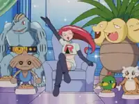 Meanwhile, James encounters the Magikarp salesman. James almost falls for the trick again, but he recognizes him. The salesman runs off, James trying to pursuit until Jessie stops him. Jessie and Meowth inform James that they are going to kidnap the performers’ Pokémon and make money off them. During McKenzie's performance, Team Rocket arrives in their balloon and they drop a bomb to create a distraction. Jessie and James perform their motto while doing a trapeze act and kidnapping the performers' Pokémon, including Naughty. James sends out Weezing to use Smokescreen on the crowd below. Misty orders her Poliwhirl out, and it douses the smog with a Bubble attack, but Team Rocket has already escaped.