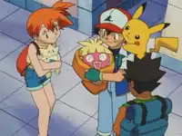 Smoochum kisses Ash on the cheek. It leaps from his arms and smooches Misty as well, then it turns its attention to kissing Pikachu. Ash reads Smoochum's Pokédex entry and Brock adds that it uses kisses as its sense of touch. Smoochum soon retrieves the dropped hat and places it on its head. As it loses its bearings, Smoochum bumps into Brock, who puts the hat on his head. Then, the screaming girls rush over to Brock, squashing and elbowing the group in the process. Togepi, Smoochum, and Pikachu are thrown out of the chaos, and Togepi and Smoochum follow a Skiploom into an alley. Unable to get Ash's attention, Pikachu goes after them. Brock is pleased with all the attention and takes off the hat, but the ladies realize that Brock isn't who they were looking for and disband. The trio notices an advertising screen above them and realizes the man they met earlier is a movie star named Brad. Misty realizes Togepi, Pikachu, and Smoochum are missing.