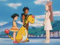 Meanwhile, Janina, who was walking near the port, is alerted to the chaos by the plume of Smokescreen from the Glittering Lighthouse. She interrupts Team Rocket's seemingly clean getaway and orders her Onix to retrieve the cage. Jessie calls on Arbok, and it wraps its tail around the cage in preparation for a counterattack. Onix deflects the Poison Sting, shielding Janina in the process. Meowth moves the balloon over the ocean, and they are just out of Onix's reach. When the situation seems hopeless, Janina notices Arbok dangling and gets an idea. She hops off Onix, then Onix bites onto a tsunami barrier and swings its tail to grab a hold of Arbok. Team Rocket tries to get away, but Onix pulls harder than the balloon can get away, which puts Arbok under more strain. Soon, Janina grabs a chipped-off piece of rock and climbs up to the cage. She gives the cage a few hits and the lock breaks open, freeing Brock. When they get down, Janina says Pikachu can use any Electric attack because Onix isn't going to be affected. Ash has Pikachu use Thunderbolt, which electrocutes Team Rocket, and then Onix tosses them out into the sky.