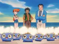 Bright returns to Dayton at the shore, not wanting to leave just yet. Dayton tells Bright he will be alright, just as a wave sweeps up Bright. Dayton wishes his friend all the best as the Chinchou's reflected yellow glow fades into the distance. Meanwhile, Team Rocket float in the ocean, waiting for something to help them. They see a bunch of yellowish bulbs and think a rescue has come. When they jump on them, the Chinchou shocks them again. Later, Ash and his friends arrive in Bluefinland. The group catches a ferry to Yellow Rock Isle, saying their goodbyes to Dayton and Daizō while doing so. At the last minute, on a wave barrier, a lone Corsola sits. Misty almost dives towards it, but Ash and Brock restrain her from jumping off.
