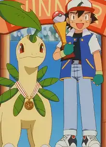 Ash and Bayleef after winning the Extreme Pokémon Race