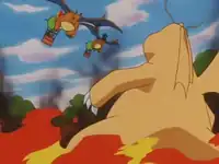 Team Rocket huddles at Ash's feet, thanking him for saving them; and Kaburagi takes the opportunity to retrieve the Dragon Fang from James. Clair begs Dragonite to recognize her and stop her attack but to no avail. Dragonite fires a Hyper Beam at her, which is only partially deflected by Charizard's Flamethrower. Although Clair is unharmed, Kaburagi finally realizes why the Pokémon is so unreasonable; he warns Clair that Dragonite is suffering from Outrage. As the guardian of the Holy Land unleashes a powerful Whirlwind that forces Dragonair to dispel its rain clouds, Misty asks Clair about Kaburagi's statement. The Blackthorn Gym Leader explains that Dragonite has become confused after performing its move too many times, causing her to attack everything she sees in a berserk fury.