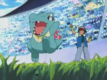 This episode marks the last time to date in which Ash has used Bayleef or Totodile in an official battle onscreen.