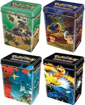 Released on October 25, 2004, the EX Deck Tins were the first collector tins to come in more than one variation, but are taller and thinner than the conventional tins that would follow. Each tin is designed to hold a 60-card deck in sleeves as well as other items, such as counters, markers, coins or dice. Each is packaged with one of four possible Cosmos Holofoil promotional cards, previously available as Non Holofoil cards via a Target promotion, two early EX Series booster packs, and a sticker sheet matching the design of the tin artwork. The artwork for each tin is taken from the Japanese booster pack artwork from four previously released expansions, which include Miracle of the Desert, Rulers of the Heavens, Magma VS Aqua: Two Ambitions and Flight of Legends.