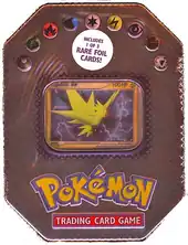 First released in early November 2005, and as late as January 2006 in some countries, the EX Collector's Window Tins were the first tins released that resemble those available in future TCG Series. Each tin is octagonal in shape, and has a window opening to display one of the three obtainable Black Star Promotional cards: Moltres ex, Articuno ex, or Zapdos ex. The design that circles the side of the tin is taken from the montage present in the Japanese PokéPark Blue file, illustrated by Kouki Saitou. Each tin also includes an assortment of three EX Series booster packs, ranging from EX Team Rocket Returns to EX Legend Maker.