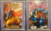 Released with the EX Dragon Frontiers expansion was the set's 9-Pocket and 4-Pocket Portfolios. Both Portfolio features artwork of Feraligatr and Typhlosion. Each binder has 10 pages, allowing for the storage of 180 cards in the 9-Pocket and 80 cards in the 4-Pocket.