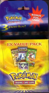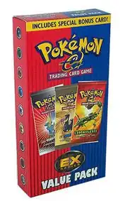 Released in March 2004 was the first promotional box set of the EX Series, the EX Series Value Pack. The box contains three booster packs, one each from the first three EX Series expansions: EX Ruby & Sapphire, EX Sandstorm, and EX Dragon. The box is unique in that the boosters are packaged in a blister, this is evident from the height of the box. Also included was a Black Star Promotional card of the Pokémon Ludicolo.