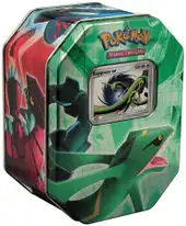 The EX Collector's Carry Tin was released in late October/early November 2005, and remains the largest individual collector's tin to be released, with storage space for well over 100 cards and accessories. The tin originates from the Japanese Gift Box Emerald, and features a plastic carry handle and metal latch, with artwork of Rayquaza battling Deoxys on the front and of Groudon battling Kyogre on the back. Each tin includes Black Star Promotional Celebi and Suicune cards, plus three EX Series booster packs.