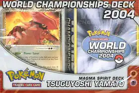 Following the success of the first Pokémon World Championships held under Pokémon USA in August 2004, the event, and the Organized Play program as a whole, was promoted further by publishing the decks of high-ranking players from each age division of the tournament as commemorative items. Released in late November 2004, these decks comprise Blaziken Tech, used by Fifteen and Over Finalist Chris Fulop, Magma Spirit, used by Fifteen and Over Champion Tsuguyoshi Yamato, Rocky Beach, used by Ten and Under Finalist Reed Weichler, and Team Rushdown, used by Eleven to Fourteen Finalist Kevin Nguyen. Each card within the decks has a unique silver border and Worlds 2004 card back, complete with the signature of the participant. None of the cards are tournament legal. Each deck is also packaged with a 2004 World Championships Booklet, containing a summary of the event and brief articles on high-ranking participants.