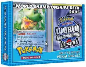 As per the previous year, another collection of decks based on those that were among the most competitive at the 2005 World Championships were made available. Released on October 31, 2005, the four 2005 World Championships Decks (Bright Aura, Dark Tyranitar, King of the West, Queendom) were used by the Ten and Under Champion, the Eleven to Fourteen Finalist, a Ten and Under Semi-Finalist, and the Fifteen and Over Champion. Each deck contains a non-tournament legal 60-card replica and special 2005 World Championships booklet.